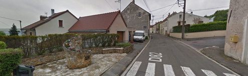 Rue Jean de la Fontaine, la route principale traversant le village, en face d'une boite postale jaune.