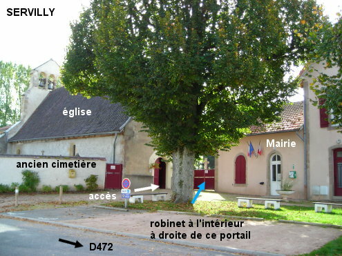 L'ancien cimetière est situé autour de l'église et derrière la Mairie. Sur la D472 en provenance de Périgny, lorsque l'on voit côté droit la Mairie derrière une grande pelouse, tourner dans la rue à droite (il n'y a pas de panneau de nom de rue ni signalisation), puis prendre l'allée piétonne avant l'église qui dessert l'entrée de l'église et deux portails du cimetière. Entrer par le portail de droite, celui entre l'église et l'arrière de la Mairie, pour trouver le robinet à l'intérieur sur la droite. N.B. : Sur la D32 en provenance de la D480 (et de Lapalisse), si l'on suit la première flèche à gauche direction Périgny, on arrive en sens inverse dans la rue et on verra donc l'église érigée côté gauche puis l'accès au cimetière.
