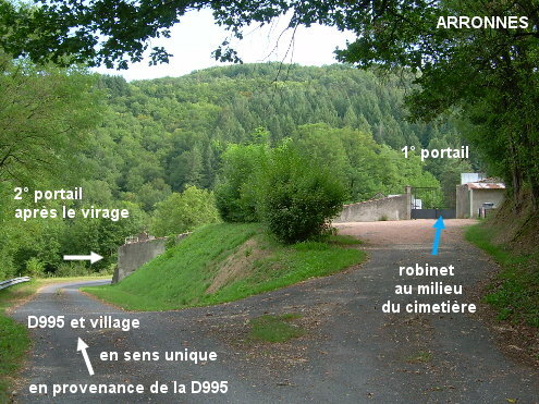 Le cimetière est situé en dehors du village. Il est desservi par une demi-boucle en sens unique greffée sur la D995 côté Ferrières-sur-Sichon. 1) A partir du village, sur la D995 en direction de Ferrières-sur-Sichon, après le carrefour à gauche avec la D176, puis 300 mètres après le panneau de fin de village, tourner à gauche en épingle en direction du cimetière (il y a une flèche, visible uniquement dans ce sens). Parcourir 100 mètres, puis encore 50 mètres sur l'allée à droite qui dessert le premier portail du cimetière qui nous fait face. Entrer et avancer une trentaine de mètres sur l'allée intérieure plane et gravillonnée pour trouver le robinet qui est au milieu du cimetière à gauche de cette allée et au sommet de l'allée asphaltée transverse qui monte depuis le deuxième portail (et se termine par quelques marches d'escaliers). 2) Sur la D995 en provenance de Ferrières-sur-Sichon (attention, c'est en descente), guetter le grand panneau ''site clunisien'' aux tons ocre avec un visage de statue en pierre, c'est juste derrière qu'il faut tourner à droite dans la route qui dessert le cimetière. Après avoir refait le plein de ses bidons, en continuant sur la route du cimetière qui est en sens unique, on revient sur la D995 peu avant l'entrée du village.