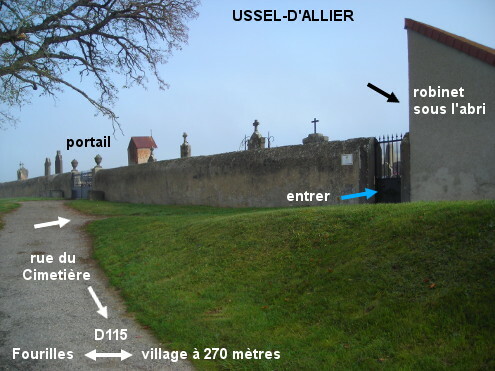 Le cimetière est implanté côté droit au bout d'une impasse débutant en dehors du village sur la D115 direction Fourilles. Environ 270 mètres après le panneau de fin de village, au niveau d'une courbe à droite juste derrière le mur d'enceinte d'une propriété et la balise réglementaire d'intersection, tourner à droite dans la rue du Cimetière. Parcourir 170 mètres (macadam en mauvais état puis tronçon final en terre battue) jusqu'au portillon situé à l'extrémité droite du mur (donc tout de suite au début du cimetière). Entrer par ledit portillon pour trouver le robinet sous l'abri dans le coin droit. N.B. : Dans l'autre sens de circulation, après un panneau annonçant des virages, regarder côté gauche pour voir (assez facilement) le cimetière qui est un peu en hauteur.