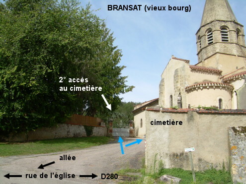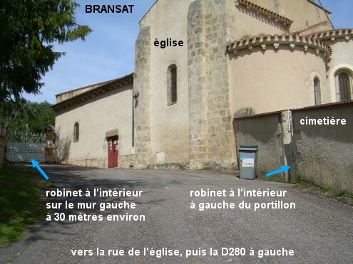 Le cimetière est implanté autour de l'église située dans le vieux bourg à proximité de la D280. 1) En provenance de Verneuil-en-Bourbonnais sur la D280, traverser la D1 et descendre en direction du ''vieux bourg''. Beaucoup plus loin, on verra l'église entourée du cimetière sur la droite dans l'angle avec la rue adjacente. Tourner à droite puis monter dans l'allée qui conduit à l'église et aux entrées du cimetière. 1) Si l'on entre à droite par le portillon situé juste avant l'église, on trouvera le premier robinet à l'intérieur sur la gauche. 2) Si l'on entre par le portail qui est au bout de l'allée, faire quinze pas en avant pour trouver le deuxième robinet fixé sur le mur de gauche (on ne le voit pas depuis le portail car le mur forme un angle ouvert). 3) P.S. : On peut prendre un raccourci au niveau du carrefour D280 / D1 par la rue de la Souche (il y a une flèche ''cimetière'') qui descend tout droit et rejoint la D280 pendant que celle-ci fait une grande courbe à droite pour revenir ensuite vers la gauche.