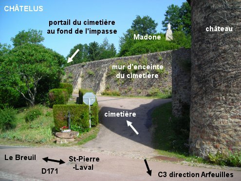 Le cimetière est situé au fond d'une impasse à proximité du château. Sur la D171 en provenance de Saint-Pierre-Laval, juste après le carrefour à gauche avec la direction d'Arfeuilles, tourner à droite derrière le château dans la rue qui monte et grimper jusqu'au portail du cimetière situé quelques mètres plus loin au fond de l'impasse. Le robinet est à l'intérieur du cimetière, à droite du portail.