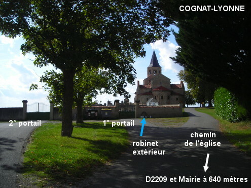 Le cimetière est situé à côté de l'église, à l'écart du village, à 810 mètres du carrefour D117 / D2209, vers la fin d'une route en impasse. En provenance de Brugheas sur la D117, au carrefour en T avec la D2209 (route à grande circulation), tourner à gauche puis 180 mètres plus loin tourner dans la première à gauche à l'angle de laquelle est implantée la Mairie, en suivant la direction de l'église. Suivre cette route qui commence par une courbe à droite, et aller jusqu'au cimetière implanté plus loin côté gauche, dont les deux portails nous font face, et situé juste avant l'église. Le robinet est à l'extérieur, à la droite du portail de droite. N.B. : Après être retourné au carrefour D117 / D2209, pour poursuivre son itinéraire sur des petites routes, il faut continuer dans le village sur la D2209 sur 270 mètres pour tourner alors à gauche dans la D222 en direction d'Espinasse-Vozelle.