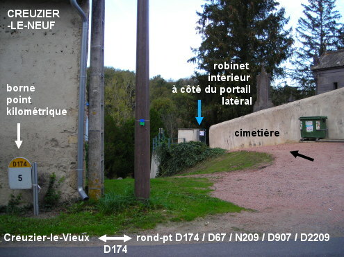 Le cimetière est implanté derrière l'église, à proximité de la D174. Il comporte trois entrées et deux robinets. Le robinet le plus facilement accessible est situé à côté d'une entrée secondaire. 1) En provenance de Creuzier-le-Vieux sur la D174, au niveau du point kilométrique 5, juste avant un virage à droite et le carrefour à gauche avec la rue qui conduit à l'église et à l'entrée principale du cimetière, prendre le chemin piéton à gauche jusqu'au portail latéral du cimetière sur la droite. Le premier robinet est à l'intérieur sur la gauche. 2) Dans l'autre sens de circulation, lorsque l'on aperçoit l'église décalée sur la droite, tourner à droite dans la place des Anciens Combattants qui se prolonge en chemin de la Vieille Tour. Aller au-delà de l'église érigée côté gauche pour trouver à sa droite le premier portail du cimetière (accompagné d'un portillon). Si l'on entre par ce portail, descendre sur les dalles puis continuer à gauche sur l'allée gravillonnée en faux-plat (100 mètres à parcourir) pour trouver le deuxième robinet à côté d'un cabanon situé à gauche. Si au lieu d'entrer tout de suite dans le cimetière, on part sur la gauche derrière l'église, on trouvera le troisième portail un peu plus loin. A partir de celui-ci on peut accéder soit au premier robinet en montant sur la branche gauche du Y lorsque l'allée se scinde, soit au deuxième robinet en descendant sur la branche droite. P.S. : Dans la direction opposée à celle du village voisin Creuzier-le-Vieux, pour éviter un tronçon à grande circulation, prendre la rue de la Mairie à droite, traverser la D2209 pour prendre presque en face (en décalé sur la gauche) la petite route passant par la zone artisanale des Ancizes et qui débouche sur un rond-point où l'on peut prendre la D558 direction Seuillet.
