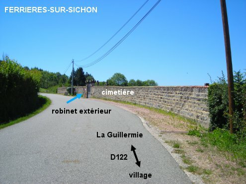 Le cimetière est implanté côté droit sur la D122 en direction de La Guillermie, 90 mètres après le panneau de fin de village. Le robinet est à l'extérieur et à gauche du portail.