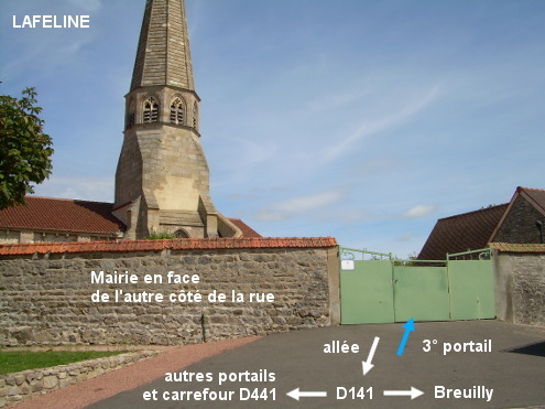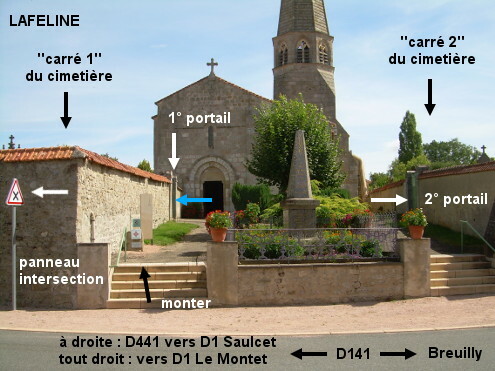Le cimetière est implanté autour de l'église. Il comporte trois portails et deux points d'eau. 1) En provenance de Saulcet par la D1 puis la D441, quand on arrive au carrefour avec la D141, le cimetière est à gauche dans l'angle avant ledit carrefour. Faire quelques mètres sur la gauche dans la D141 direction Cesset pour trouver sur la gauche les deux premiers accès au cimetière de part et d'autre de l'église. Monter les escaliers en direction de l'église qui s'ouvre en face, entrer par le portail du cimetière qui est dans le mur à gauche avant l'église. Le premier robinet est à l'intérieur à droite du portail. 2) Il n'y a pas de robinet à proximité du deuxième portail (celui qui est à droite de l'église). 3) En provenance de Breuilly sur la D141, quand on arrive en vue de l'église érigée côté droit, entrer à droite par le portail (le troisième des portails du cimetière) qui est situé presque en face de la Mairie implantée à gauche de la route. On trouvera alors un duo de robinets à droite de ce portail (deux robinets-vannes, l'un avec un tuyau, l'autre sans tuyau duquel l'eau gicle donc).
