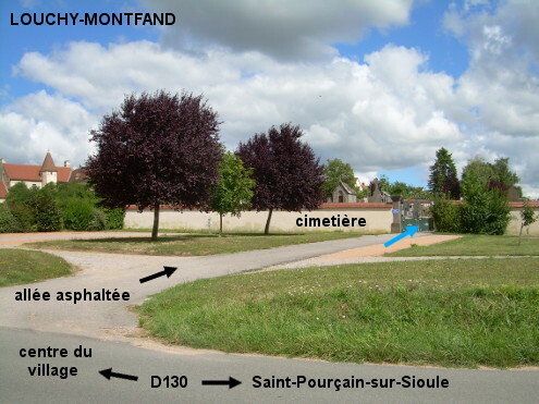 Le cimetière est implanté côté droit à l'entrée du village, très en retrait par rapport à la D130 en provenance de Saint-Pourçain-sur-Sioule, juste après le panneau de début. Une allée asphaltée de 30 mètres perpendiculaire à la route dessert le portail du cimetière. Entrer à l'intérieur pour trouver le robinet immédiatement à droite.