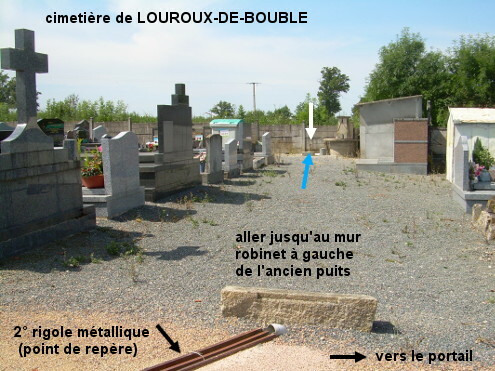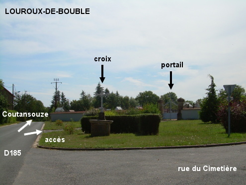 Le cimetière est implanté à côté de la D185. Pour trouver le robinet : entrer et marcher tout droit jusqu'à la deuxième rigole métallique dans l'allée gravillonnée (30 mètres) puis prendre l'allée transverse à droite jusqu'au mur (15 mètres). Le robinet est fixé sur une tige à gauche d'un ancien puits, lui-même à gauche d'un cabanon contre le mur. 1) Sur la D185, en provenance de Lapeyrouse, 100 mètres après le carrefour à droite avec la D224 direction Echassières, on verra le cimetière côté droit derrière la ''rue du Cimetière''. Son portail sur un mur oblique est desservi par une allée asphaltée de 30 mètres débutant juste après la rue du Cimetière. 2) Sur la D185 en provenance de Coutansouze, 700 mètres après l'intersection avec la D129, on sera à hauteur de l'allée qui dessert le cimetière côté gauche.