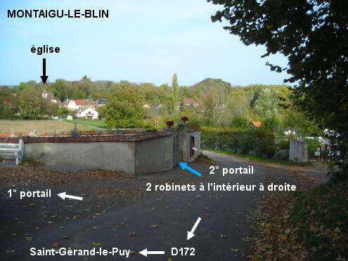 Le cimetière est situé dans une rue secondaire à la périphérie du village à 200 mètres de la D172 direction Saint-Gérand-le-Puy. 1) Sur la D172 en provenance de Saint-Gérand-le-Puy, 140 mètres après le panneau de début de village, tourner à gauche en direction du cimetière. Celui-ci est implanté côté gauche. Entrer par le deuxième portail (celui de droite) pour trouver les deux robinets sur la même arrivée d'eau à l'intérieur sur la droite. 2) A partir du village, sur la D172 direction Saint-Gérand-le-Puy, c'est longtemps après le carrefour D172 / D32 que l'on arrivera vers la petite route conduisant au cimetière (à l'angle il y a une croix, une borne incendie rouge, et la flèche ''le cimetière'').