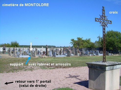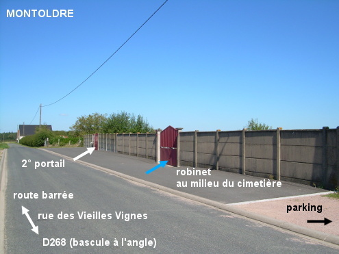 Le cimetière est situé dans une rue secondaire à 20 mètres de la D268. Le robinet est au milieu du cimetière. Le plus simple est d'entrer par le premier portail (celui de droite, qui donne dans la partie la plus récente encore partiellement vide). Avancer alors de 40 mètres dans l'allée jusqu'à la grande croix implantée à sa droite puis faire 10 mètres sur la gauche pour trouver le robinet sur un petit poteau auquel sont accrochés des arrosoirs (repérables de loin) au bord de la partie où il y a des sépultures (N.B. : L'aspect des lieux va évoluer avec les futures inhumations). En provenance de Varennes-sur-Allier sur la D268, à l'endroit où elle oblique à droite, tourner à gauche dans la rue des Vieilles Vignes (repérable à l'ancienne bascule située sur l'îlot dans le carrefour) pour arriver 20 mètres après à côté du premier portail du cimetière implanté côté droit. P.S. : La suite de la rue, qui présente d'importantes fissures longitudinales et un affaissement partiel, est condamnée par un énorme monticule de terre (on peut toutefois passer à vélo sur le côté gauche), elle débouchait sur la D21 direction Tréteau et permettait aussi de prendre à cet endroit sur la droite un raccourci conduisant à la D32 direction Boucé.