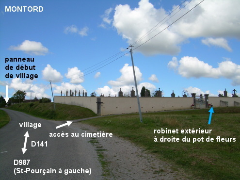 Le cimetière est situé à l'extérieur du village, au bord de la D141 quand on prend la direction de St-Pourçain-sur-Sioule. 1) C'est quand on roule sur cette D141 en provenance de la D987 et en direction du village, que l'on verra face à soi le portail du cimetière qui est implanté côté droit. Ce portail est desservi par une allée de 20 mètres perpendiculaire à la route et qui longe le mur du cimetière. Le robinet est fixé sur le mur extérieur, à droite du portail et à droite d'un gros pot de fleurs. 2) Sur la D141 en provenance de Cesset, à l'intersection avec la D115 dans le village, continuer tout droit en direction de Saint-Pourçain-sur-Sioule (via la D987). On passera 210 mètres plus loin devant le panneau marquant la fin du village. Continuer sur 150 mètres puis prendre à gauche l'allée qui dessert le portail du cimetière.