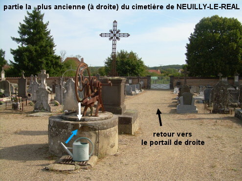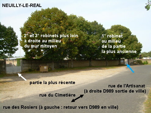 Le cimetière est situé dans une rue secondaire. Il est fléché à partir de la D989 à proximité du carrefour avec la D105 direction Montbeugny. Ses robinets ne sont pas installés à côté des portails mais au milieu ou vers le milieu. 1) En provenance de Montbeugny sur la D105, au carrefour en T avec la D989 tourner à droite direction Toulon-sur-Allier puis 70 mètres après tourner dans la première à gauche en suivant la flèche ''cimetière'' (rue des Rosiers), 170 mètres plus loin tourner dans la première à droite (autre flèche). On arrivera ensuite vers le cimetière implanté côté gauche. 1a) Le portail de droite (à 170 mètres du début de la rue) donne dans la partie la plus ancienne du cimetière. Entrer et avancer de 40 mètres sur l'allée gravillonnée, regarder derrière la croix et l'ancienne pompe qui sont au milieu pour trouver le robinet. 1b) Le premier portail que l'on rencontre, celui de gauche, donne dans la partie la plus récente. Si l'on est entré dans cette partie plus proche, il faudra toutefois avancer de 45 mètres sur l'allée intérieure puis faire 15 mètres à droite sur l'allée transverse pour trouver un premier robinet fixé sur le mur mitoyen des deux parties. P.S. : Il y a un autre robinet plus loin à sa gauche sur ce mur, à côté du passage faisant communiquer les deux parties du cimetière. 2) Dans le cas où l'on viendrait de Toulon-sur-Allier par la D989 (tronçon à grande circulation), 170 mètres après le panneau marquant le début de la ville, tourner dans la première à droite en suivant la flèche ''cimetière'' (rue de l'Artisanat) puis 90 mètres après tourner dans la première à gauche (autre flèche) pour arriver 110 mètres plus loin à hauteur du portail de droite du cimetière implanté côté droit.