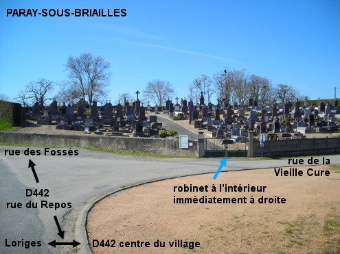 Le cimetière est situé en dehors du village au bord de la D442. Sur la D142 en provenance de Marcenat, continuer tout droit en direction de Loriges, sur la D442. Environ 260 mètres après le carrefour à gauche avec la rue conduisant à la Mairie, tourner dans la troisième à droite (rue du Repos) au début de laquelle il n'y a qu'une petite flèche d'un itinéraire cyclo. Le cimetière est implanté côté droit 270 mètres plus loin, 190 mètres après le panneau de fin de village sur la D442, juste après le pont sur la rivière, derrière l'angle avec une rue adjacente. Le portail est situé au début de la rue perpendiculaire et le robinet est à l'intérieur du cimetière, immédiatement sur la droite.