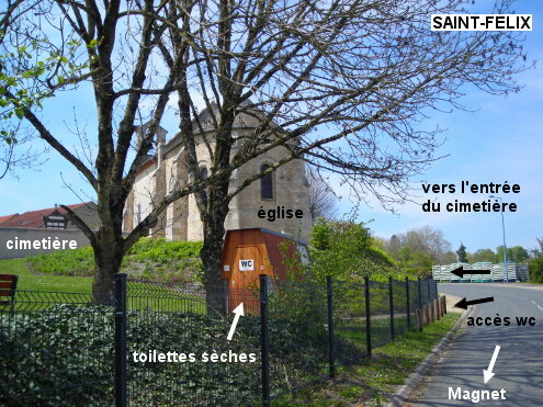 Le cimetière est situé à côté de l'église au bord de la D173. Le robinet est à l'intérieur du cimetière à gauche du portail. Sur la D173 en provenance de Saint-Germain-des-Fossés (ou de Billy par la D430 qui rejoint la D173), vers la fin du village on arrivera au niveau du cimetière implanté côté droit juste avant l'église. P.S. : Pour ceux qui ont aussi besoin d'éliminer, il y a des toilettes sèches (donc sans eau) 50 mètres plus loin, derrière l'église et à côté d'un terrain de sport (330 mètres après le panneau fléché ''WC public'' implanté à l'angle avec la rue adjacente conduisant à la Mairie).