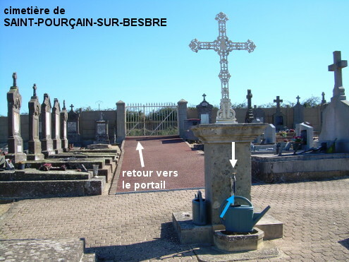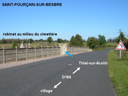 Le cimetière est situé en dehors du village, il est implanté côté gauche sur la D164 direction Thiel-sur-Acolin, 170 mètres après le panneau de fin de village. Le robinet est à l'intérieur au milieu du cimetière. Entrer et avancer de 20 mètres sur l'allée asphaltée pour trouver le robinet au dos de la croix qui est au milieu de cette allée centrale.