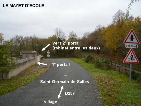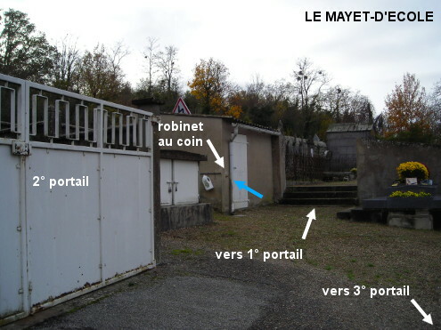 Le cimetière est situé en dehors du village. Il est implanté côté gauche sur la D257 direction Saint-Germain-de-Salles, 180 mètres après le panneau de fin de village. Il comporte deux parties, trois portails, mais un seul robinet, situé entre le premier et le deuxième portail. 1) Si l'on entre par le premier portail (celui de gauche, le plus proche du village), il faudra se diriger vers la droite (25 mètres d'allée gravillonnée) et descendre trois marches d'escaliers pour trouver le robinet à l'angle d'un cabanon. 2) La meilleure option est d'entrer par le deuxième portail car dans ce cas il n'y a que 10 mètres à faire sur la gauche pour trouver le robinet à l'angle du cabanon (et déjà visible depuis le portail).