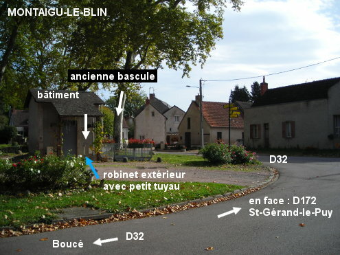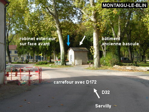 Le robinet est fixé sur le bâtiment d'une ancienne bascule située à côté du carrefour de la D32 avec la D172 direction Saint-Gérand-le-Puy. Sur la D32 en provenance de Servilly, à l'endroit où elle oblique à droite en direction de Boucé tandis que sur la gauche la D172 part en direction de Saint-Gérand-le-Puy, on verra dans l'angle côté droit et au bord d'un espace arboré, le bâtiment d'une ancienne bascule. Le robinet se trouve sur le mur extérieur à droite de la porte, qui est située en regard de la D32 direction Boucé (donc à l'opposé du côté qui nous fait face quand on arrive de Servilly).