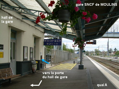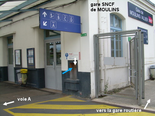 1) Le robinet se trouve dans une niche dans le mur du bâtiment de la gare SNCF vers l'extrémité quand on sort du hall du côté des voies, sur le premier quai (quai A) et que l'on se dirige vers la gauche, vers l'accès au parvis de la gare routière. 2) On peut accéder au robinet sans passer par le hall : au niveau du rond-point à côté de la gare, entrer sur le parvis et longer le côté gauche du bâtiment de la gare jusqu'à l'ouverture dans l'enceinte grillagée qui donne directement accès au quai A. Entrer pour trouver le robinet tout de suite à droite vers le coin du bâtiment.