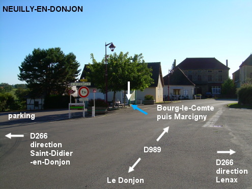 Ce robinet se trouve contre le panneau d'informations touristiques au bord du parking situé dans l'angle de l'intersection entre la D989 direction Marcigny et de la D266 direction Saint-Didier-en-Donjon. 1) En provenance de Lenax sur la D266, à l'intersection avec la D989, tourner à droite puis traverser aussitôt sur le passage piéton pour rejoindre le parking et se diriger vers la droite vers le grand panneau d'informations touristiques qui fait face à la D989. On trouvera le robinet sur son côté gauche près du sol. 2) En provenance de Bourg-le-Comte sur la D989, au niveau de l'église érigée côté gauche et juste avant l'intersection avec la D266, on verra au bord du parking côté droit un panneau d'informations touristiques. Le robinet est à sa gauche.