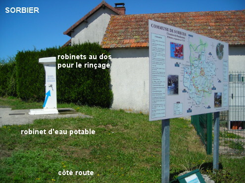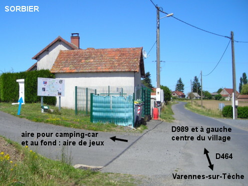 L'aire pour camping-car est située à la périphérie du village sur la D464 en direction de Varennes-sur-Tèche. 1) Sur la D464 en provenance de Varennes-sur-Tèche, on verra l'aire pour camping-car sur le côté gauche. Sur la borne blanche implantée côté droit peu après l'entrée du site, le robinet qui délivre de l'eau potable (cela est précisé en Français, en Anglais et en Allemand) est celui sur le côté droit (donc côté route). 2) Sur la D989 en provenance du Donjon, juste après le panneau de début de village (dans l'autre sens on est averti en présignalisation par une flèche avec le pictogramme des aires pour camping-car), tourner à gauche dans la D464. Dans ce cas, l'aire se verra côté droit 380 mètres plus loin, mais au dernier moment car masquée par un bâtiment juste avant.