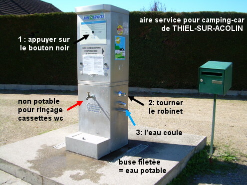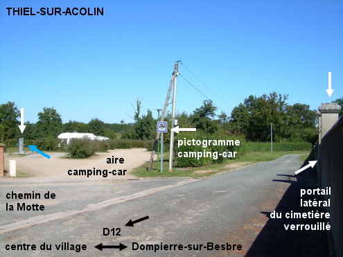 L'aire pour camping-car est située dans une rue secondaire, en face d'un côté du cimetière qui est implanté au bord de la D12 à la sortie du village quand on roule en direction de Dompiere-sur-Besbre. 1) En provenance de Dompierre-sur-Besbre sur la D779 puis la D12, peu après le panneau de début de village, à la fin du cimetière implanté côté droit tourner à droite en suivant le panneau fléché avec le pictogramme des aires pour camping-car. Environ 30 mètres après, face au portail latéral du cimetière, entrer à gauche sur l'aire pour camping-car. Longer son côté gauche (30 mètres sur terre battue) jusqu'à la borne parallélépipédique ''aire services''. Pour faire couler l'eau, appuyer d'abord sur le bouton noir situé en haut de la face avant puis tourner le robinet situé sur le côté droit de la borne (à l'opposé de la rue) : c'est en effet celui d'eau potable dont la buse d'écoulement est filetée (pour le raccord avec le tuyau pour remplir les cuves d'un camping-car). N.B. : L'autre robinet situé sur la face avant n'est destiné qu'au rinçage des cassettes wc et il est explicitement signalé comme ayant de l'eau non potable. 2) Sur la D12 en provenance de Montbeugny, traverser tout le village (on croise l'intersection avec la D31, puis on passe le carrefour à droite avec la D164 venant de Saint-Pourçain-sur-Besbre). 2a) Vers la fin, quand on apercevra le portail latéral du cimetière côté gauche face au court ''chemin de la Motte'', on pourra prendre ce raccourci, et au débouché en T sur la rue le long du côté du cimetière, entrer à gauche sur l'aire pour camping-car en suivant le panneau fléché puis idem point 1. 2b) Ou sinon, tourner à gauche juste avant le cimetière et la borne du point kilométrique 22. Attention : dans ce sens on ne voit pas le panneau fléchant l'aire pour camping-car.