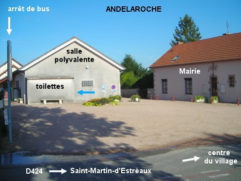 Les toilettes sont implantées contre la salle polyvalente, en face de la Mairie. Sur la D424 en direction de Saint-Martin-d'Estréaux, immédiatement après le panneau de début du village tourner à gauche sur l'esplanade en terre battue devant la Mairie (sise au n°1301). Les toilettes sont indiquées par des panneaux avec le pictogramme dédié, elles sont contre le bâtiment de la salle polyvalente, leur entrée est sur la droite (face à la Mairie).
