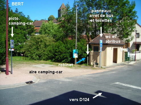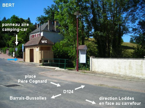 Les toilettes et le robinet de l'aire pour camping-car sont situés à 50 mètres de la D124 et du carrefour avec la petite route conduisant à Loddes, au bord duquel il y a un square où est implanté le Monument aux Morts. Sur la D124 en provenance de Barrais-Bussolles, au carrefour précité, tourner dans la rue à gauche derrière le square (direction opposée à celle de Loddes). Le bâtiment des toilettes type vespasienne et avec un abribus inclus en son milieu, est implanté côté droit 50 mètres plus loin. Ces toilettes n'ont ni lavabo ni robinet, mais juste après il y a une petite aire pour camping-car signalée par le pictogramme ad-hoc avec son robinet fixé sur une tige à côté du bâtiment des toilettes.