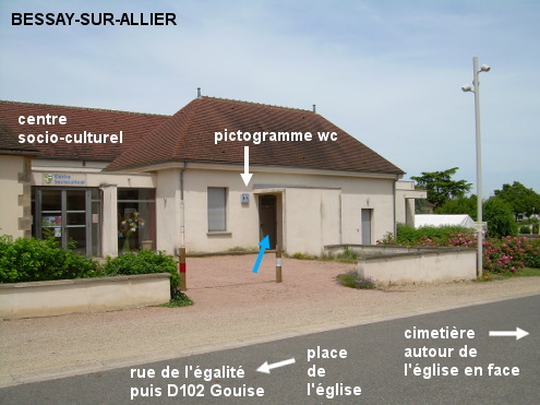 Ces toilettes se trouvent dans le même bâtiment que le ''centre socio-culturel'' sis en face de l'église et du cimetière, tous fléchés, à environ 85 mètres de la D102 direction Gouise. 1) En provenance de La Ferté-Hauterive, la D300 après le rond-point et après avoir franchi le pont sur la voie ferrée rejoint la N7 en centre-ville. Tourner à droite et plus loin tourner à gauche dans la D102 direction Gouise. Environ 130 mètres après, tourner à gauche dans la rue de l'Égalité (suivre les flèches). Peu après on arrive au carrefour derrière lequel le cimetière est implanté côté droit. Le centre socio-culturel est situé à gauche en regard du cimetière. Entrer à gauche dans la cour gravillonnée du centre socio-culturel pour trouver à droite de son entrée la porte des toilettes accompagnée du grand panneau carré avec le pictogramme ad-hoc. N.B. : Le lavabo étant trop petit pour remplir un bidon, on peut utiliser le robinet du cimetière en face. 2) En provenance de Gouise sur la D102, juste avant le panneau triangulaire annonçant le stop à 150 mètres (le carrefour avec la N7), tourner à droite en suivant la flèche ''centre socio-culturel'' et idem ci-dessus.