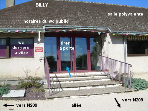 Les toilettes se trouvent dans l'entrée de la salle polyvalente sise au bord de la N209, à proximité du carrefour avec la D430. Quand on est dans le sas d'entrée de la salle polyvalente, les toilettes sont sur la gauche. N.B. à l'attention des dames : Le lavabo dans la partie ''WC femmes'' au fond, est trop petit pour remplir un bidon directement. Il faudra utiliser le lavabo de la partie ''WC hommes'' (au début des toilettes sur la gauche) qui est situé dans le recoin derrière la porte. N.B. : Les toilettes sont accessibles de 8h à 18h seulement. Sur la D130 en provenance de Marcenat, au carrefour dans le village avec la N209 (route à très grande circulation) prendre celle-ci à gauche, puis juste après le carrefour à droite avec la D430 direction Saint-Félix, prendre l'allée sur la droite qui passe à côté du Monument aux Morts et dessert la salle polyvalente (dont la façade nous fait face) avant de revenir sur la N209 quelques centaines de mètres avant le carrefour avec la suite de la D130 qui part à droite vers Sanssat. Monter les cinq grandes marches plates jusqu'à la porte vitrée de la salle polyvalente pour trouver ensuite les toilettes à l'intérieur sur la gauche.