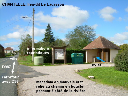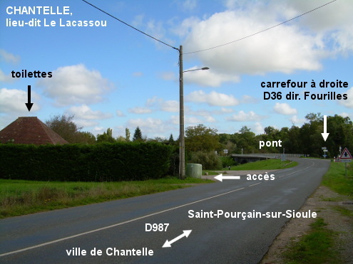 Ces toilettes se trouvent en dehors de la ville, dans le lieu-dit Le Lacassou près de la rivière La Bouble, sur une sorte d'aire de repos au bord de la D987 direction Saint-Pourçain-sur-Sioule, peu avant le carrefour avec la D36 direction Fourilles. 1) Sur la D987 en provenance de la ville et en direction de Saint-Pourçain-sur-Sioule, après une série de trois panneaux successifs : celui annonçant un virage à gauche, celui de présignalisation du carrefour à droite avec la D36 direction Fourilles, et celui annonçant un carrefour sur route prioritaire, 770 mètres après le panneau marquant la fin de la ville de Chantelle entrer à gauche derrière la haie arbustive sur l'aire de repos (macadam en mauvais état) pour trouver le grand bâtiment des toilettes contre la haie (à 15 mètres du bord de la D987). 2) Sur la D987 en provenance de Saint-Pourçain-sur-Sioule, après le carrefour à droite avec la D282 venant de Deneuille-lès-Chantelle, après le pont sur la rivière, 80 mètres après le carrefour à gauche avec la D36 venant de Fourilles, entrer à droite sur l'anneau de l'aire de repos avec le grand panneau d'informations touristiques situé au bord de la route, pour trouver le grand bâtiment des toilettes avec son évier extérieur, sur la droite à côté du point tri de collecte.