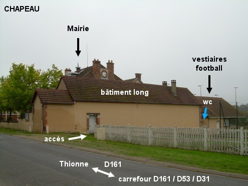 Les toilettes se trouvent dans le même bâtiment que les vestiaires du terrain de football situé près de la Mairie sise sur la D161 direction Thionne. 1) En provenance de Montbeugny sur la D161, celle-ci rejoint la D53 juste avant le village (à ce carrefour en T tourner à gauche), ensuite continuer tout droit au rond-point avec la D31 venant à droite de Neuilly-le-Réal, puis peu après au carrefour en croix avec à gauche la D31 venant de Thiel-sur-Acolin, quitter la D53 et tourner à droite dans la suite de la D161 en direction de Thionne (qui donne aussi accès à la D162 direction Mercy). Environ 190 mètres après ce carrefour, juste après le terrain de football bordé d'arbres (il y a aussi des barrières blanches entre ces arbres et la route), et avant un long bâtiment perpendiculaire à la route côté droit, prendre l'allée piétonne (30 mètres avec herbe) jusqu'au petit bâtiment qui abrite les vestiaires et les toilettes situé derrière le long bâtiment précité. La porte des toilettes (identifiée par les pictogrammes ad-hoc) est la première porte face à soi et en regard du long bâtiment. 2) En provenance de Thionne sur la D161, surveiller le côté gauche de la route pour repérer la Mairie en retrait par rapport à la route et juste avant un long bâtiment perpendiculaire. Traverser alors sur le passage piéton (à demi-effacé) pour prendre l'allée piétonne entre ce long bâtiment et le terrain de football situé après celui-ci, et ainsi trouver les toilettes dans le petit bâtiment à gauche de cette allée et situé après le long bâtiment.