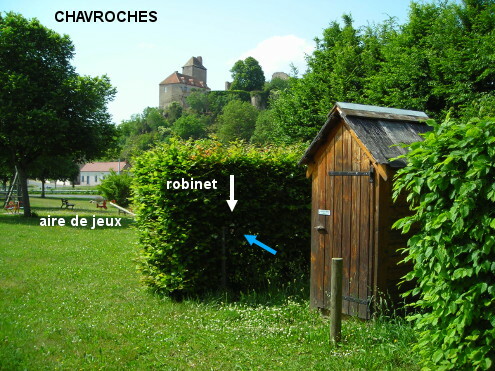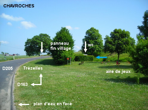 Ces toilettes se trouvent sur une aire de jeux à la sortie du village sur la D205 direction Trézelles. Sur cette route, après le carrefour sud avec la D163 et juste avant le panneau de fin de village, on verra côté gauche un plan d'eau et côté droit sur un espace gazonné et arboré une aire de jeux au fond de laquelle se trouve le cabanon en bois des toilettes entouré de trois haies arbustives (on n'aperçoit donc que son toit de loin) et à côté d'une grande haie parallèle à la route. N.B. : Il s'agit de toilettes sèches, donc sans chasse d'eau mais avec de la sciure de bois (pas d'inquiétude, il n'y a pas d'odeur), il y a cependant à l'extérieur un robinet monté sur une tige, contre la haie à gauche de la porte du cabanon des toilettes.