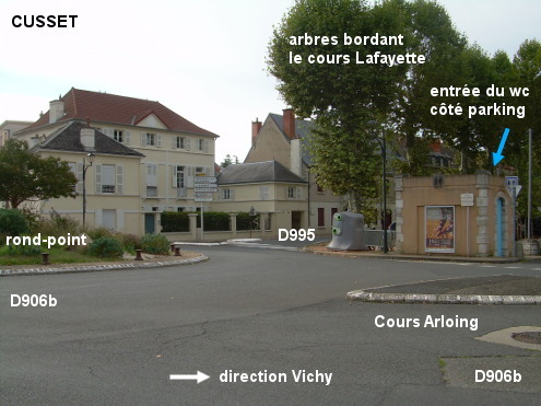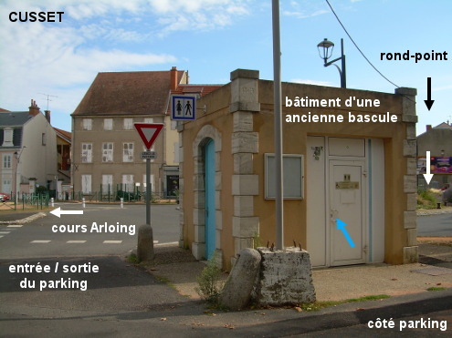 Ces toilettes se trouvent dans le bâtiment d'une ancienne bascule, situé à côté du rond-point D995 / D906b et au bord d'un parking. Il s'agit d'une cabine WC à nettoyage automatique dotée d'un lavabo avec cellule à détection (il faut mettre la main en haut très près de la cellule et insister pour déclencher l'écoulement de l'eau). 1) Sur la D62 en provenance de Molles et du Mayet-de-Montagne, au rond-point avec la D906b tourner à gauche en direction du centre-ville. Au rond-point suivant la D906b oblique à droite tandis que tout droit débute la D995 longée à sa droite par un long parking bordé d'arbres. Le petit bâtiment dans lequel est installée la cabine WC est en face, de l'autre côté du rond-point, à côté d'une entrée du parking. La porte de cette cabine est située côté parking, à l'opposé du rond-point. 2) En provenance de Charmeil sur la D27, circuler toujours tout droit à une succession de carrefours et rond-points. Au deuxième rond-point après le pont sur l'Allier du lieu-dit Boutiron, quitter la D27 mais continuer tout droit en direction du centre-ville. Au carrefour avec feux tricolores après le troisième rond-point, continuer tout droit dans la D906b en direction du centre-ville et du Vernet, à cet endroit (cours Arloing) il est possible d'emprunter la bande cyclable à double sens aménagée sur le côté gauche pour éviter la forte circulation automobile. Au cinquième rond-point, on verra le bâtiment des toilettes à sa droite. 3) Sur la D175 en provenance du Vernet et de Busset, au carrefour en T tourner à gauche (rue du Faubourg du Chambon), au carrefour suivant tourner à droite dans la rue bordée à gauche d'arbres le long du parking. Peu après, en roulant tout droit on rejoint la D995 qui vient d'Arronnes sur la droite. Juste après, on arrivera au rond-point avec la D906b : faire le tour complet pour entrer sur le parking à côté des toilettes.