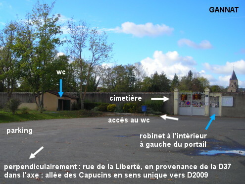 Ces toilettes se trouvent devant le cimetière qui est situé dans une rue secondaire et n'est pas indiqué par un fléchage. Le petit bâtiment des toilettes est accolé au mur avant du cimetière vers la gauche, il est desservi par une rampe qui descend et débute à côté du portail. N.B. : Les deux lavabos sont petits, mais il y a un robinet à l'intérieur du cimetière à gauche du portail (entrer par le portillon situé à droite de celui-ci). Les horaires d'ouverture du cimetière sont de 7h30 à 20h du 01 avril au 30 septembre (il ferme à 18h du 01 octobre au 14 novembre, à 17h30 du 15 novembre au 15 janvier, et à 18h du 16 janvier au 31 mars). Pour trouver le cimetière, les indications sont les suivantes. 1) Sur la D37 venant de Mazerier, lorsqu'on aperçoit le rond-point où elle rejoint la D2009, tourner à droite dans la rue Charles Magné (flèche ''syndicat des eaux''), puis 200 mètres après dans la première à gauche (derrière le bâtiment du syndicat des eaux) : c'est la rue de la Liberté menant au cimetière implanté côté droit 200 mètres plus loin, très en retrait (30 mètres) derrière un grand parking. Pour repartir on peut prendre l'allée des Capucins à gauche qui débouche sur la D2009 juste après le rond-point précité, et ensuite suivre la direction de la gare SNCF pour rejoindre la D419 direction Poëzat. 2) Sur la D327 en provenance de Saulzet, lorsque l'on arrive à un rond-point où on aperçoit La Poste vers la gauche, tourner à droite, au deuxième rond-point tourner à gauche dans la D37 direction Mazerier et immédiatement à gauche dans la rue Charles Magné en direction du Syndicat des Eaux, puis idem ci-dessus. 3) Sur la D516 venant de Bègues, ignorer la seule flèche ''cimetière'' qui pointe dans la direction d'où l'on vient ! A ce carrefour, continuer tout droit (rue de la Croix des Rameaux) puis prendre la première à gauche qui est en retrait derrière un petit parking. On arrive alors vers le cimetière par la rue de la Liberté dans le sens inverse de celui décrit au premier point. Le cimetière est donc côté gauche dans ce cas-ci.