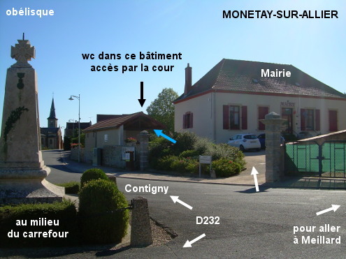 Les toilettes se trouvent dans un grand bâtiment situé dans la cour de la Mairie sise D232 à côté de l'obélisque érigée au milieu du carrefour mitoyen. Sur la D232 en provenance de Contigny, quand on arrive face à l'obélisque, entrer à gauche dans la cour de la Mairie (dont la façade n'est pas orientée vers la route ni face au sens d'où l'on vient). Le bâtiment dans lequel il y a les toilettes est situé immédiatement à gauche, à gauche de celui de la Mairie. P.S. : Pour faciliter la suite de son parcours, on peut s'aider du plan affiché sous la partie abritée du bâtiment avant la porte des toilettes. Par exemple, en continuant à gauche de l'obélisque puis tout droit, on traversera la D2009 à très grande circulation pour poursuivre sur la route de Meillard qui rejoint la D217.