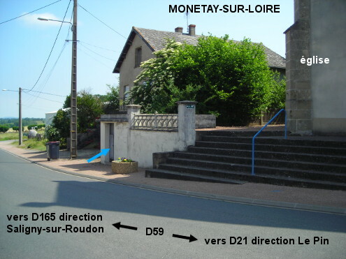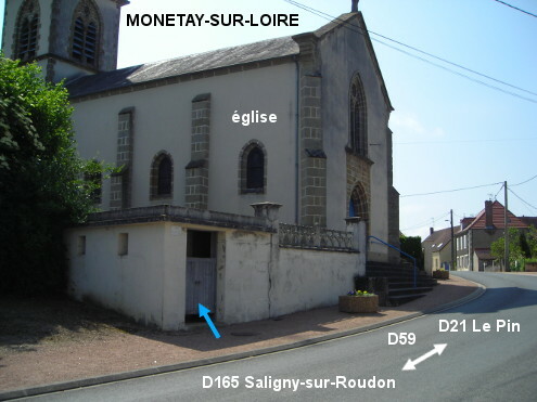 Les toilettes sont situées à côté de l'église, au bord de la D59. Sur la D59, en provenance du Pin via la D21, on verra l'église érigée côté droit en léger surplomb, et l'entrée des toilettes à gauche des escaliers menant à l'église. Le robinet est sur le mur gauche juste derrière la petite porte à double battants sur ressorts.