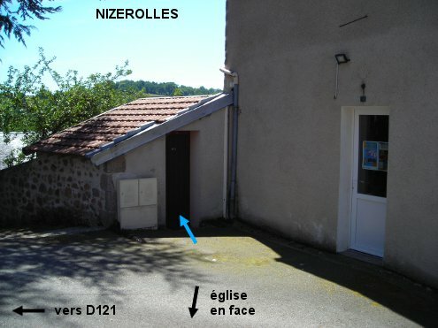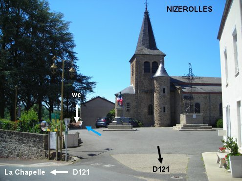 Les toilettes sont situées au fond d'une place, en face de l'église, à 30 mètres de la D121. Sur la D121 en direction de La Chapelle, on verra en face de soi, à un endroit où la route vire à gauche, l'église au fond d'une place. Se diriger tout au fond vers la gauche pour trouver le petit bâtiment des toilettes accolé à un grand bâtiment. N.B. : Le lavabo est trop petit, mais sur le tuyau d'arrivée d'eau, entre le lavabo et le WC, il y a un robinet annexe qui permet de remplir ses bidons (attention : l'eau est susceptible de gicler au début !).