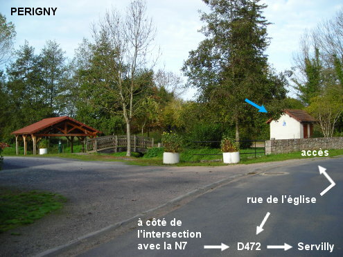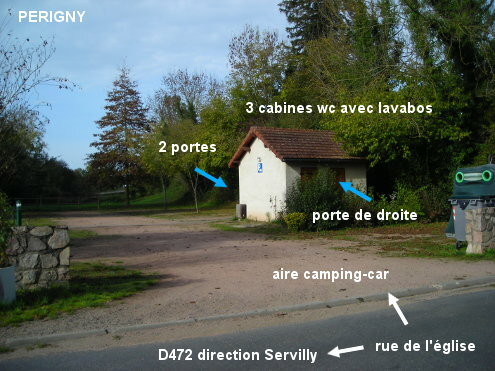L'aire pour camping-car est implantée au début de la rue partant en direction de l'église et du cimetière, située à proximité de l'intersection avec la RN7 de la D472 direction Servilly. 1) Sur la D472 en provenance de Magnet, 170 mètres après la traversée de la RN7 (dangereuse !), tourner à gauche en direction du cimetière pour trouver quelques mètres après, côté gauche, l'aire pour camping-car. Entrer sur cette aire, après le pont sur la rivière et entre deux murets. Le bâtiment des toilettes est implanté immédiatement à droite. Il comporte trois cabines WC (porte de droite côté rue, deux portes côté opposé), chacune équipée d'un lavabo permettant le remplissage de grands bidons. 2) Sur la D472 en provenance de Servilly, 50 mètres après le panneau de début de village, tourner à droite dans la rue de l'église pour trouver l'aire pour camping-car et ses toilettes peu après.