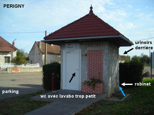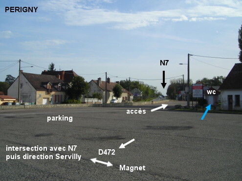 Le petit bâtiment de ces toilettes se trouve sur un immense parking situé à côté de l'intersection de la D472 et de la RN7. Sur la D472 en provenance de Magnet, le parking est implanté côté droit dans l'angle avant la RN7. Entrer sur le parking et parcourir plusieurs mètres jusqu'au petit bâtiment carré à toit pointu des toilettes. N.B.1 : Le lavabo dans la cabine WC récemment rénovée est trop petit, mais il y a un robinet extérieur sur le bas du mur droit du bâtiment. Il y a aussi de vieux urinoirs sur l'arrière du bâtiment (côté opposé à l'entrée de la cabine WC). N.B.2 : En hiver le WC reste ouvert avec l'eau disponible au lavabo, mais par contre l'eau est coupée sur le robinet extérieur.