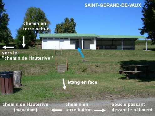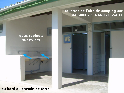 Ces toilettes se trouvent sur l'aire pour camping-car (très bien fléchée) située en dehors du village au bord de l'étang communal du Moulin. A partir de la Mairie au bord de la D32 (un plan de la commune est affiché sur un grand panneau) prendre la direction de La Ferté-Hauterive puis 20 mètres après le carrefour à gauche avec la D105 direction Varennes-sur-Allier, tourner à droite (rue du Lavoir) en direction de l'étang communal et de l'aire pour camping-car. Suivre ensuite la succession de panneaux fléchés avec le pictogramme camping-car. A la sortie du village la ''rue du Lavoir'' devient le ''chemin de Hauterive''. Passer à côté de l'extrémité de l'étang très long situé sur la droite, franchir le petit pont puis tourner à droite (540 mètres après avoir quitté la D32) dans le deuxième chemin de terre (déconseillé aux roues de vélo fragiles !). Rouler prudemment sur ce chemin caillouteux avec des ornières (320 mètres à parcourir), ignorer le premier embranchement à gauche pour prendre le deuxième : c'est la branche de la boucle qui passe devant le bâtiment des toilettes avant de revenir à cet embranchement en longeant l'étang. On découvrira alors après un arbre l'immense bâtiment blanc tout en longueur situé côté gauche, comportant des toilettes dans sa partie centrale. Il dispose de deux éviers extérieurs dans lesquels on peut facilement remplir des très grands bidons.