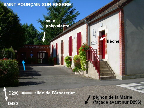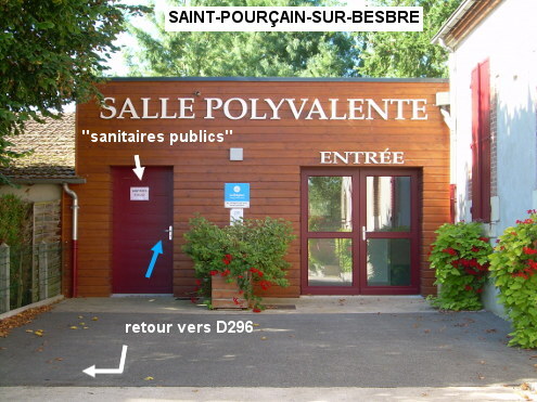 Les toilettes se trouvent dans le même bâtiment que la salle polyvalente (fléchée) qui est située près de la Mairie sise au bord de la D296. En provenance de Saligny-sur-Roudon sur la D55 puis la D296 (et après l'intersection avec la D480 puis juste avant le village le carrefour à droite avec la D181 desservant le parc animalier du Pal), tourner à droite juste après la Mairie sise côté droit puis entrer aussitôt à gauche sur l'allée qui mène à la salle polyvalente. La porte des toilettes (revêtue d'une affiche ''sanitaires publics'') est à gauche de l'entrée de la salle polyvalente (à 50 mètres de la D296).
