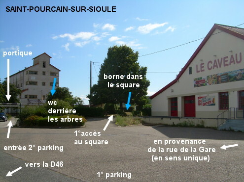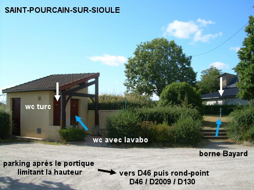 Ces toilettes (il y a aussi une borne Bayard à proximité) se trouvent au fond d'un parking situé au début de la D46 en direction de Varennes-sur-Allier près du rond-point avec la D130 et la D2009, non loin de l'ancienne gare SNCF. 1) Sur la D130 en provenance de Loriges, au début de la ville, juste après l'ancienne gare implantée très en retrait à droite, juste avant le panneau triangulaire annonçant le rond-point, tourner à droite dans la rue en sens unique (rue de la Gare) qui débouche plus loin sur un premier parking devant un caveau vinicole (vu en août 2023 avec le nom ''le caveau'' écrit en très grosses lettres sur la façade). Continuer tout droit (mais en décalé sur la gauche) afin de passer sous le portique limitant la hauteur des véhicules pour l'accès au deuxième parking (30 mètres à faire ensuite sur du gravillonné). Le petit bâtiment des toilettes est sur la droite derrière la végétation qui le masquait de loin. N.B.1 : On trouvera le lavabo derrière la porte de droite. N.B.2 : Les quelques marches d'escaliers entre deux haies à droite avant les toilettes mènent à un square en herbe au milieu duquel il y a une borne Bayard (tourner le dessus un moment pour que l'eau coule). On peut aussi accéder à ce square directement depuis le premier parking en continuant tout droit dans l'axe de la rue de la Gare. N.B.3 : Sur cette borne l'eau reste disponible en hiver, comme dans les toilettes. 2) A partir d'autres provenances (aux carrefours où on ne voit ni la direction de Varennes-sur-Allier ni la D2009, tourner à droite), après avoir franchi le pont sur la Sioule sur la D2009, au rond-point D2009 / D130 / D46, tourner à gauche dans la D46 direction Varennes-sur-Allier (route à très grande circulation) sur quelques mètres puis entrer à droite sur le parking et se diriger vers la gauche pour passer sous le portique et trouver les toilettes (à 120 mètres du rond-point).