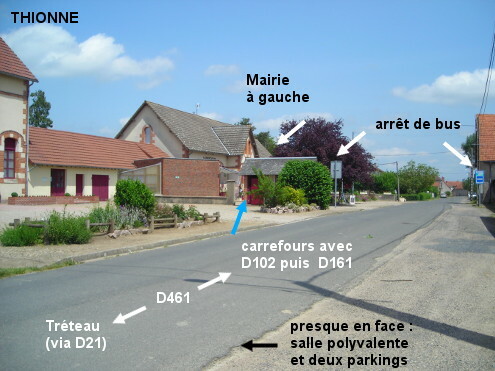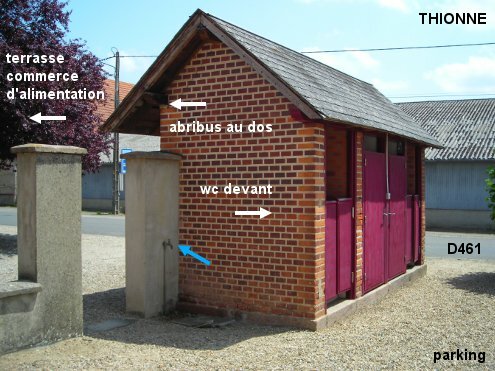 Les toilettes sont situées dans le même bâtiment qu'un abribus sur un parking à proximité de la Mairie, sur la D461 en direction de Tréteau. 1) En provenance de Tréteau sur la D461, on verra côté gauche un grand parking au bout duquel est implanté le bâtiment des toilettes (orientées face à soi) à hauteur de deux panneaux d'arrêt de bus au bord de la route. Le robinet est à l'extérieur sur la gauche dans le coin entre le bâtiment et un muret. 2) A partir de la D161 ou de la D102, prendre la D461 en direction de Tréteau puis 280 mètres après le carrefour avec la D102 on verra côté droit un grand bâtiment en retrait dont la première partie abrite la Mairie et la deuxième un commerce de village avec terrasse puis au bord de la route l'abribus derrière lequel se trouvent les toilettes.