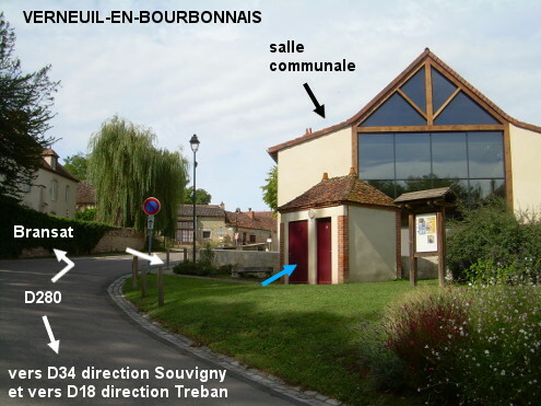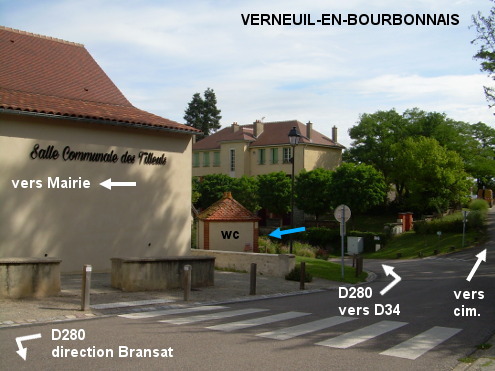 Le petit bâtiment des toilettes est situé à côté de la salle communale, non loin de la Mairie, au bord de la D280. 1) Sur la D280 en provenance de Bransat, au carrefour en T face à la Mairie, tourner à droite dans la suite de la D280 et faire encore quelques mètres. Les toilettes sont sur la gauche, juste après la salle communale (cela est écrit dessus), dans l'intérieur du virage à gauche que fait la D280. N.B. : Le lavabo dans la cabine WC de droite est trop petit, par contre celui dans celle de gauche accessible aux handicapés est suffisamment grand pour remplir y compris des très grands bidons. 2) Dans l'autre sens de circulation sur la D280, c'est peu après les deux panneaux annonçant un passage piéton et la traversée d'écoliers (l'école est en effet située peu après le début de la rue adjacente à gauche) que l'on verra dans l'intérieur du virage à droite le petit bâtiment des toilettes avant le grand bâtiment qui est celui de la salle communale.