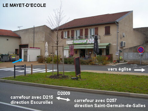 Le petit bâtiment des toilettes se trouve au bord d'un parking situé à proximité de l'église le long de la D2009 (route à très grande circulation), entre le carrefour avec la D257 et celui avec la D215. Sur la D257 en provenance de Saint-Germain-de-Salles, tourner à gauche sur la D2009 et 130 mètres plus loin, peu après l'église érigée côté droit, entrer à droite sur le parking (il y a une flèche indiquant les toilettes). Le petit bâtiment des toilettes est presque en face sur la gauche (à côté d'un restaurant à sa droite). Il s'agit d'une cabine WC à nettoyage automatique concernée par une fermeture de 22h à 6h. N.B. : En ressortant du parking sur la droite, on rejoindra 380 mètres plus loin sur la droite la D215 direction Escurolles.