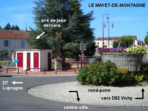 Ces toilettes se trouvent à côté d'une aire de jeux et au bord du rond-point situé à proximité du centre-ville. 1) En provenance de Laprugne par la D7 (ou de Saint-Clément via la D120), en suivant la direction du centre-ville on arrive directement sur ledit rond-point, et là on verra sur la gauche le petit bâtiment des toilettes. N.B. : Le lavabo, dans la cabine WC derrière la porte gauche, est relativement petit. 2) En provenance de Vichy sur la D62 ou de Ferrières-sur-Sichon sur la D49, suivre également la direction du centre-ville pour arriver sur une autre branche du rond-point en question. Dans ce cas, l'emplacement des toilettes sera situé côté droit. 3) En provenance de Lapalisse sur la D7 ou de Châtel-Montagne sur la D207, traverser le centre-ville. Lorsque l'on voit un sens interdit en face, prendre sur la gauche la rue parallèle pour arriver là aussi sur le rond-point, et trouver les toilettes dans l'axe en face cette fois-ci.
