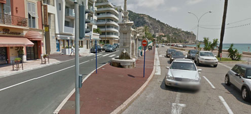 La fontaine est située devant l'hotel "Paris-Rome", du côté de la route opposé au bord de mer.