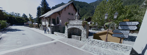 Sur la D2202 qui traverse le village, juste à coté de la pharmacie au centre du village, en face de la route qui arrive de Péone (D29).