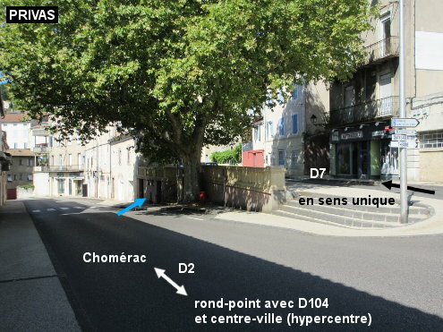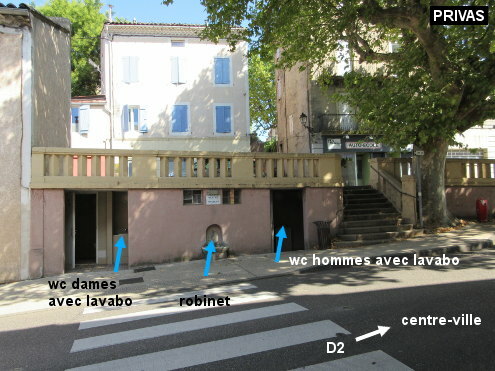 Ces toilettes se trouvent en centre-ville dans le mur de soutènement d'une rue en surplomb, au bord de la D2 direction Chomérac, non loin du deuxième rond-point avec la D104. N.B. : En plus d'un lavabo dans chacune des deux parties de ces toilettes, il y a un robinet extérieur dans une niche entre les deux entrées. 1) En provenance des Ollières-sur-Eyrieux sur la D2, suivre le virage à gauche puis au grand carrefour complexe suivre le virage à droite de la D2. Au premier rond-point avec la D104 suivre la direction de Chomérac à droite sur la D104, qui se superpose à la D2 jusqu'au deuxième rond-point, et à celui-ci prendre la suite de la D2 à gauche sur la deuxième sortie en suivant toujours la direction de Chomérac. Peu après ce deuxième rond-point, juste après un carrefour en Y avec une rue en sens unique à droite, sur la branche gauche (tout droit) qui descend et après un arbre on découvrira face au passage piéton l'entrée des toilettes à droite dans le mur de soutènement. 2) En provenance de Berzème et du col du Benas sur la D7, environ 220 mètres après le panneau de début de ville tourner en direction de Chomérac dans la deuxième à droite (boulevard Henri Savy puis boulevard de Paste) puis au rond-point prendre la D2 en direction du centre-ville à gauche sur la deuxième sortie (rue Ludovic Bacconnier, puis avenue de Chomérac après un rond-point). Au sortir d'un virage à droite surveiller le côté gauche de la rue pour repérer l'entrée des toilettes face au passage piéton (350 mètres après le dernier rond-point).