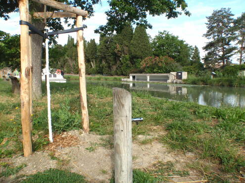Point d’eau (borne) sur la rive droite du canal au pont de Villesèquelande, à la halte fluviale, en face du lavoir, avec tables à l’ombre (il y a aussi de l’eau au cimetière proche)